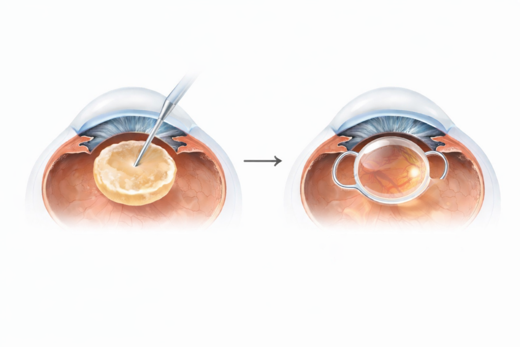 A cataract is the progressive loss of transparency of the eye’s natural lens, causing blurred vision, loss of contrast, and difficulty driving or reading.